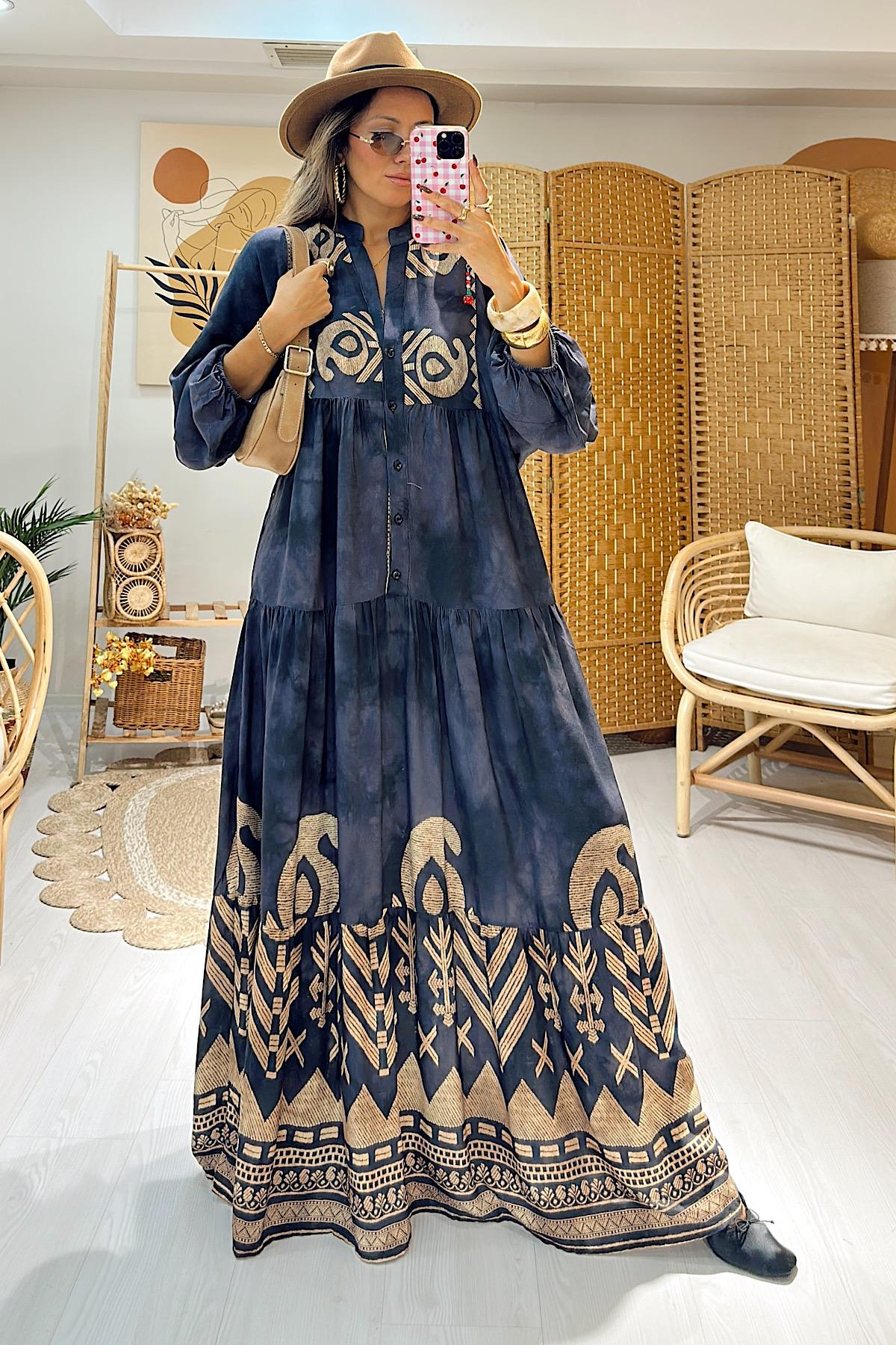 Etnik Desen Elbise-Antrasit