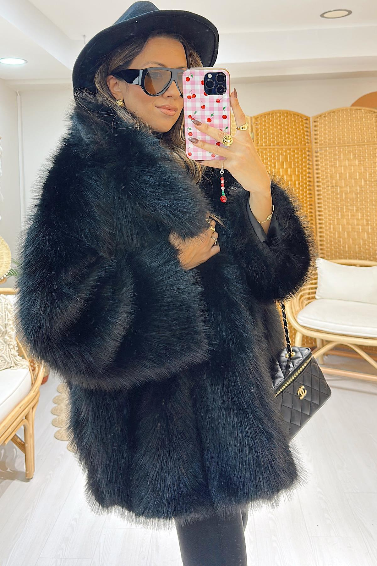 Oversize Kemerli Suni Kürk- Siyah